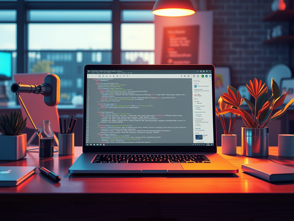 > “ノートパソコンとコードエディタをモチーフにしたモダンなデザイン”