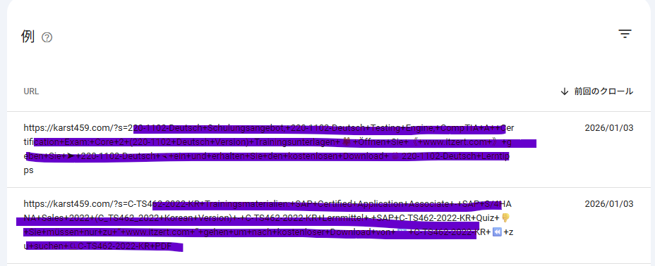 | 数が増え続ける | 攻撃が続いていると、新しいURLが一覧に追加され続けることはある。noindex で除外されていれば、検索結果には載らない。 |